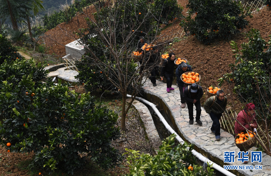 1月7日,毛相林(右二)和下莊村村民在背運剛采摘的柑橘。新華社記者王全超 攝