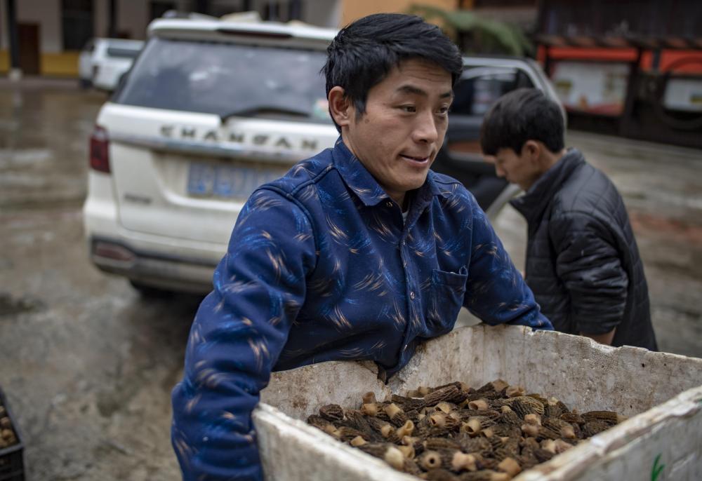云南貢山縣獨(dú)龍江鄉(xiāng)龍?jiān)濉爸赂荒苁帧焙蜁杂涝卩l(xiāng)里賣(mài)羊肚菌(2019年4月19日攝)。 新華社記者 江文耀 攝