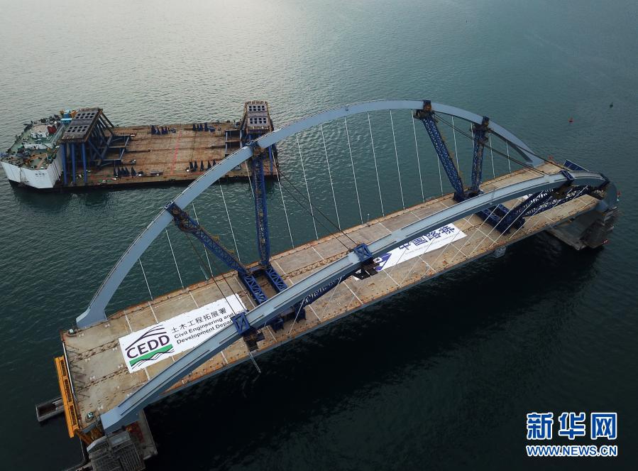 2月26日,從早晨7時開始,歷時5個小時,首次利用海潮漲落的“浮托法”,70多位現場施工人員經過緊張調試,將內地預制好的雙拱鋼橋精準對接并安裝在橋墩上。