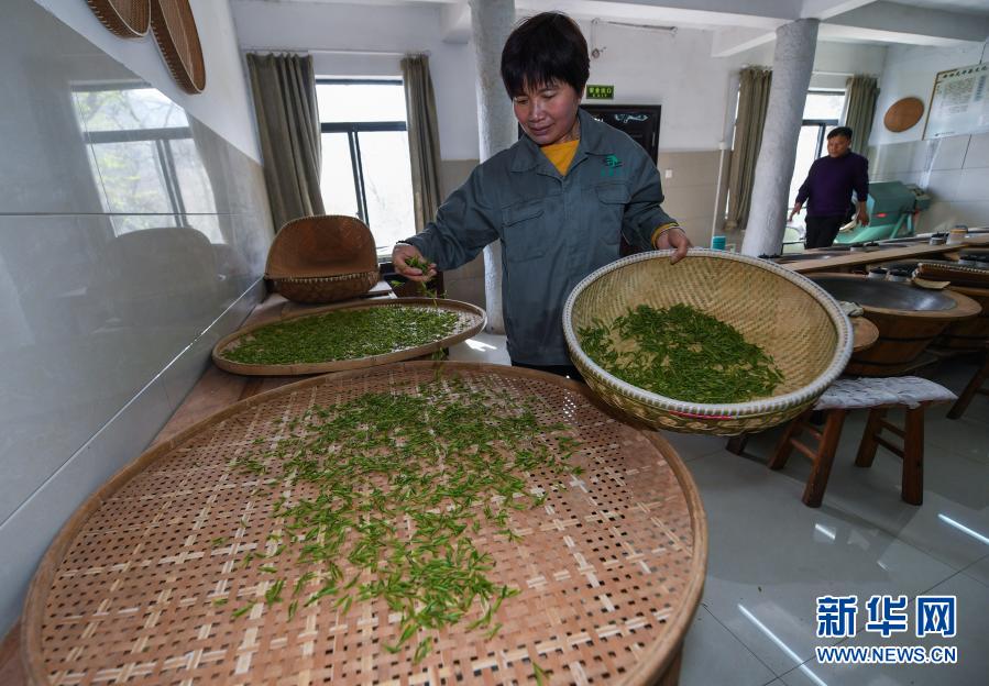 3月12日,在杭州市西湖風景名勝區滿覺隴村的中國茶葉博物館滿覺隴炒茶中心內,茶農把西湖龍井茶鮮葉進行攤青。