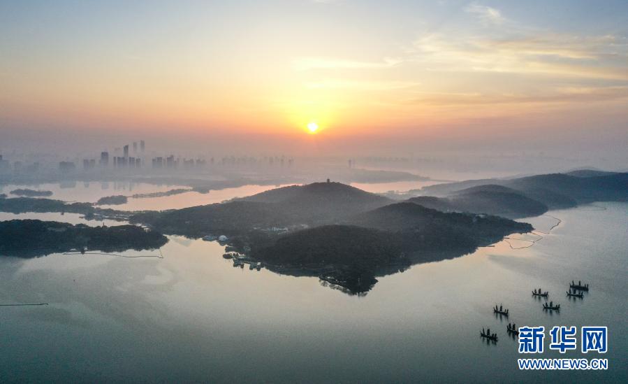 3月13日拍攝的江蘇省無錫市太湖黿頭渚景區晨景(無人機照片)。