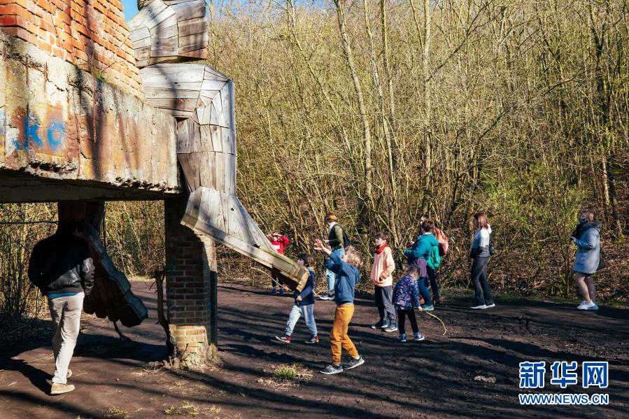 3月20日,人們在比利時博姆市的德舒爾森林公園和一座“巨人”雕塑“玩耍”。新華社記者 張鋮 攝