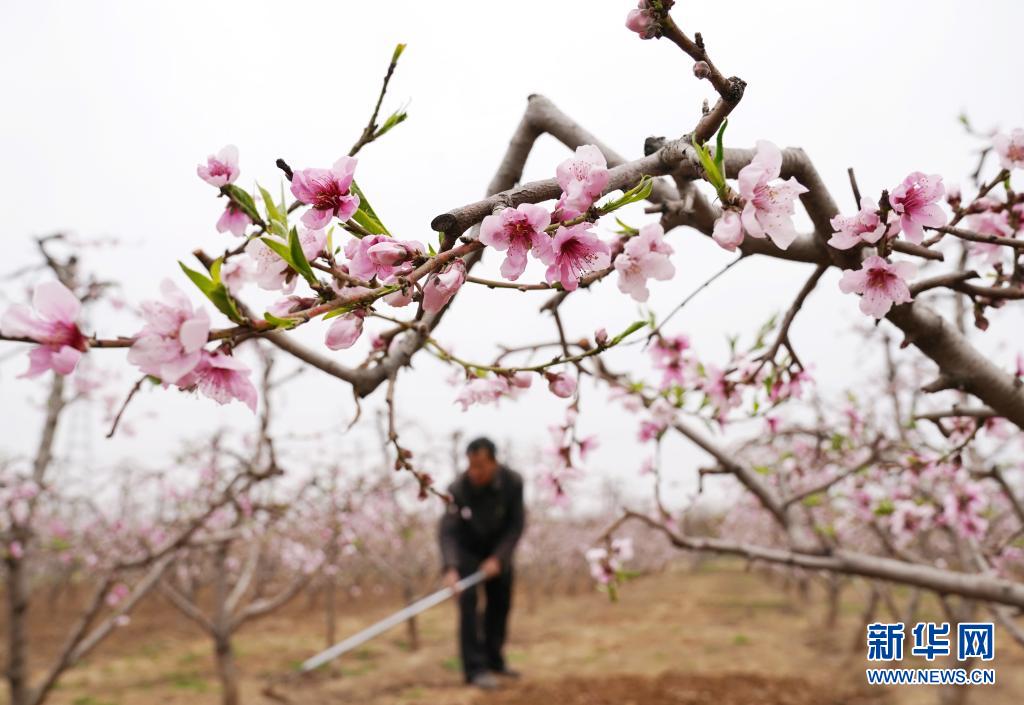 4月5日,河北省順平縣河口鄉大李各莊村的農民在桃園內除草。