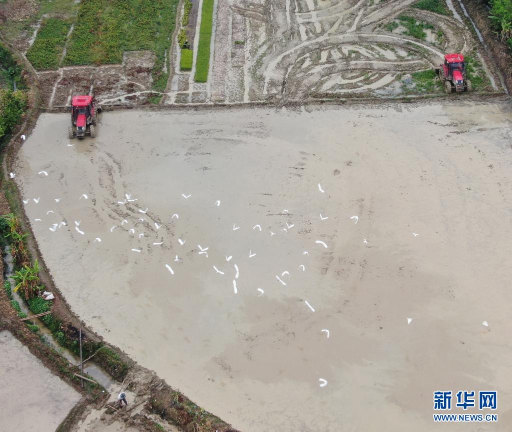 4月5日,云南西雙版納傣族自治州勐海縣勐遮鎮曼么勒村的農民駕駛拖拉機耕田(無人機照片) 。