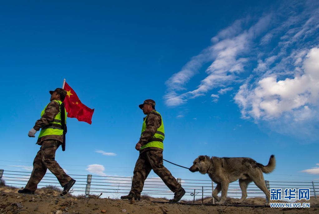 新疆生產建設兵團第10師185團職工馬軍武(右)在巡邏途中(4月9日攝)。