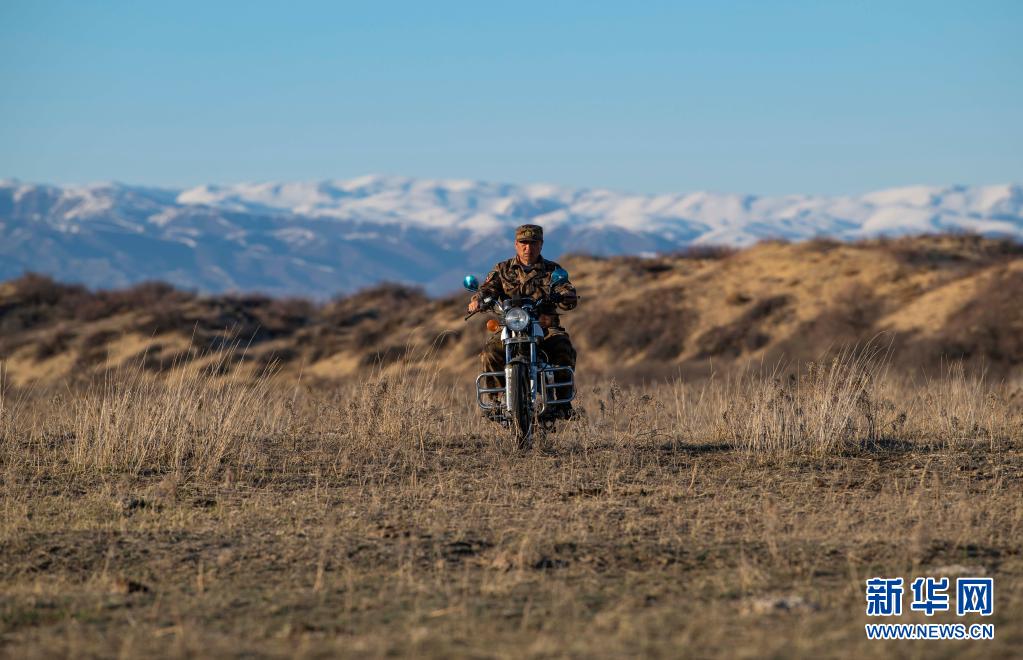 新疆生產(chǎn)建設(shè)兵團第10師185團職工馬軍武騎摩托行駛在管護轄區(qū)內(nèi)(4月9日攝)。