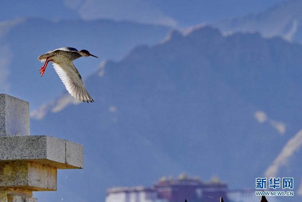 初夏,紅腳鷸在位于西藏拉薩的拉魯濕地國家級自然保護區內起舞覓食。