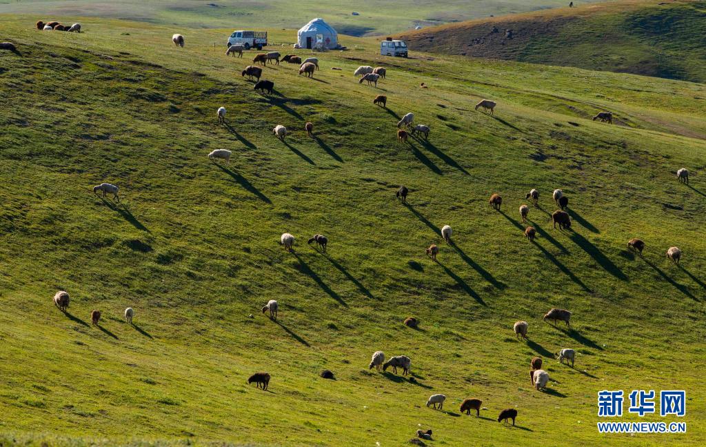 新疆裕民縣巴爾魯克山區夏牧場上的羊群、氈房、汽車(6月14日攝)。