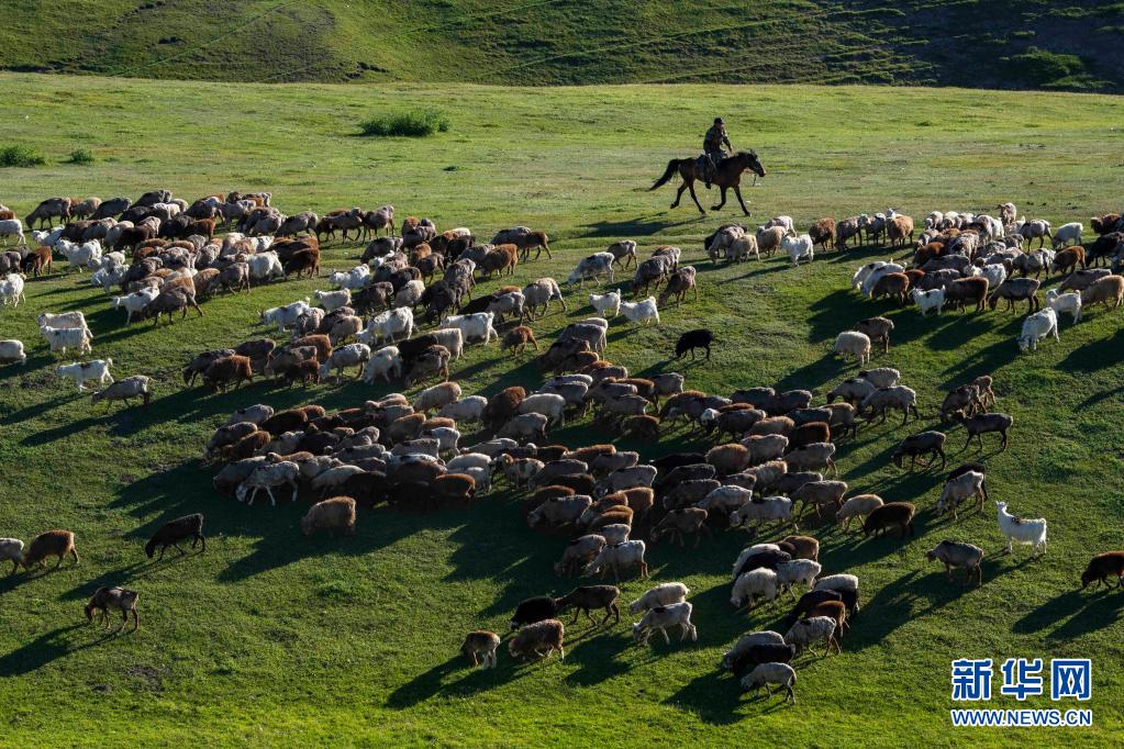 新疆裕民縣的牧民在巴爾魯克山區(qū)夏牧場(chǎng)上放牧(6月14日攝)。