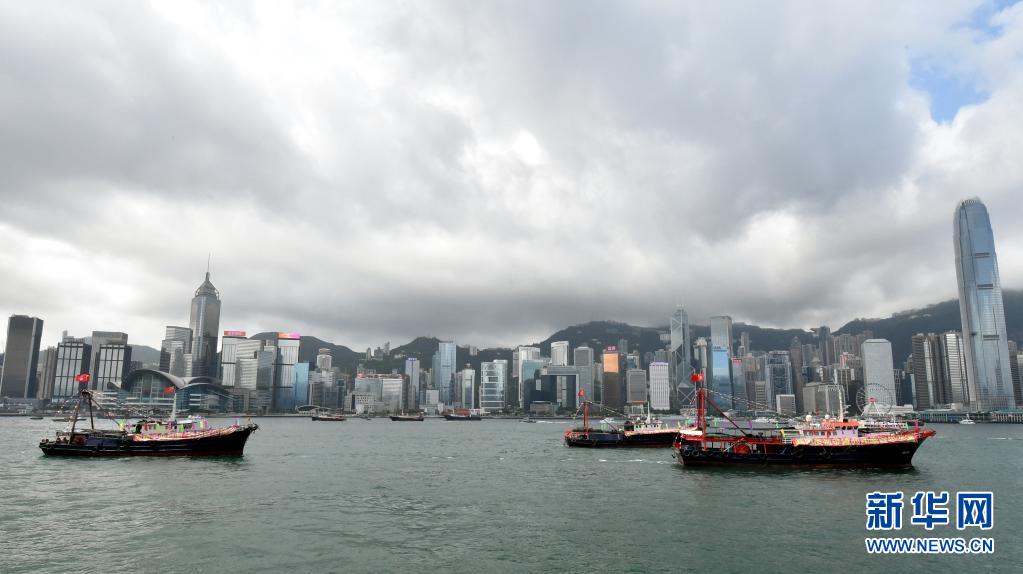 7月1日,懸掛國旗、區旗的漁船在維港巡游。新華社記者 盧炳輝 攝