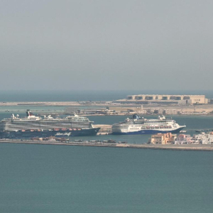 这是3月6日在卡塔尔首都多哈的港口拍摄的滞留的“迈希夫五号”邮轮(左)(手机照片)。新华社记者 汪强 摄