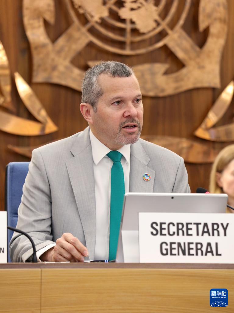 3月18日,国际海事组织秘书长多明格斯在英国伦敦举行的国际海事组织理事会第36届特别会议上致辞。新华社发(国际海事组织供图)