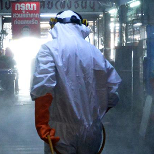 6月21日,工作人員在泰國首都曼谷一處生鮮市場進(jìn)行消毒。