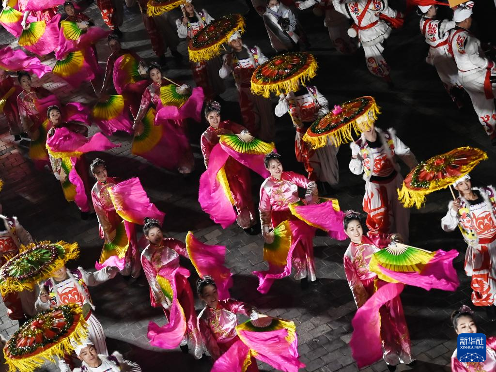 演员在榆林老街非遗大集开集仪式上表演秧歌(2月17日摄)。