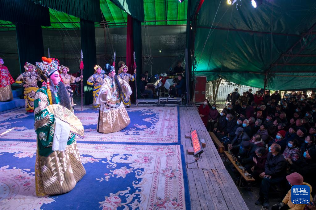 2月20日,在浙江省金华市金东区孝顺镇中街村广场,村民在观看婺剧表演。