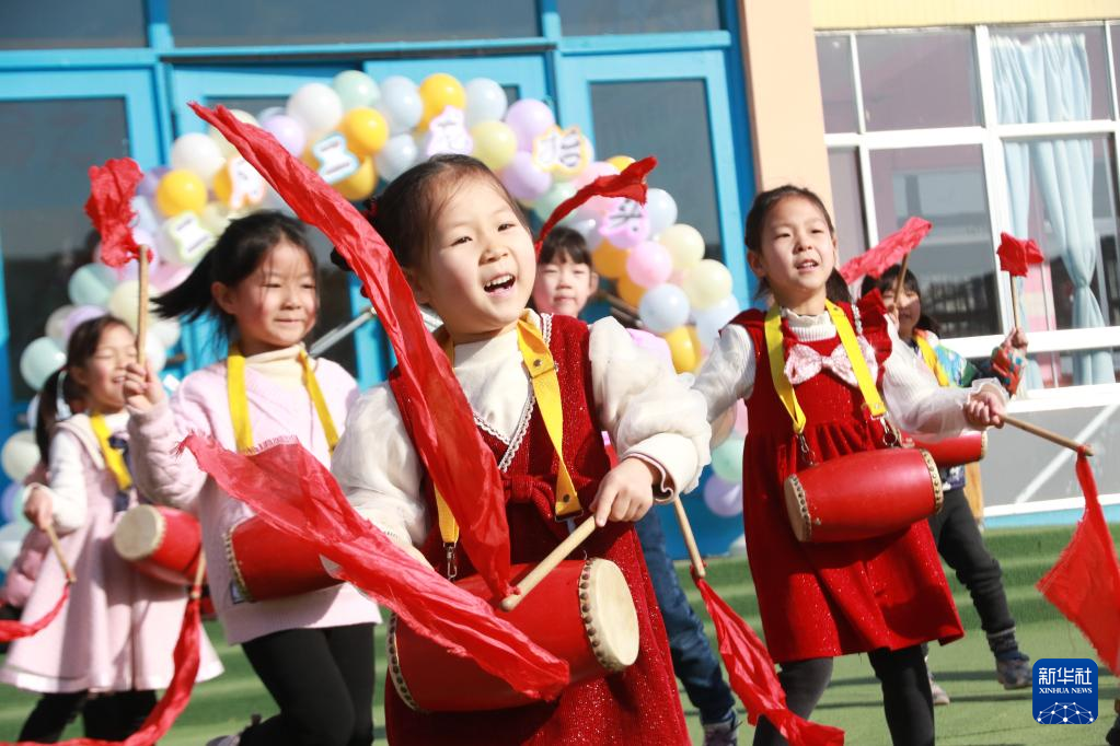 2月20日,山东省高密市密水街道中心幼儿园的孩子们在打腰鼓。