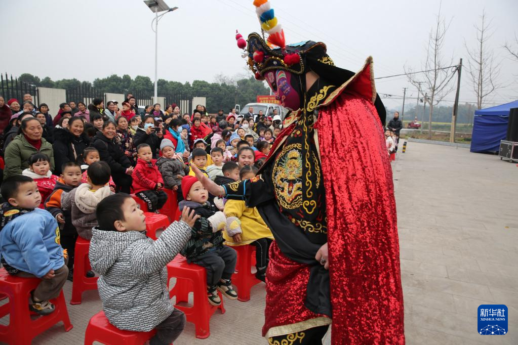 2月21日,四川眉山市东坡区心连心艺术团演员在崇礼镇复盛社区表演川剧绝活“变脸”,并与现场观众互动。