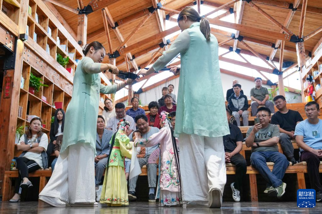 孙菁(前左)和施锦芳在七都镇江村文化礼堂表演昆曲木偶(5月17日摄)。