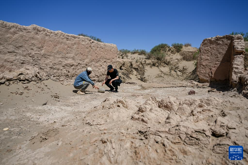 6月2日,额济纳旗文物保护中心工作人员在居延遗址附近查看散落的陶片。