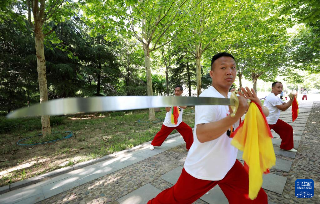 6月9日,太极拳爱好者在河北省邢台市任泽区人民广场展示王其和太极拳器械太极刀。