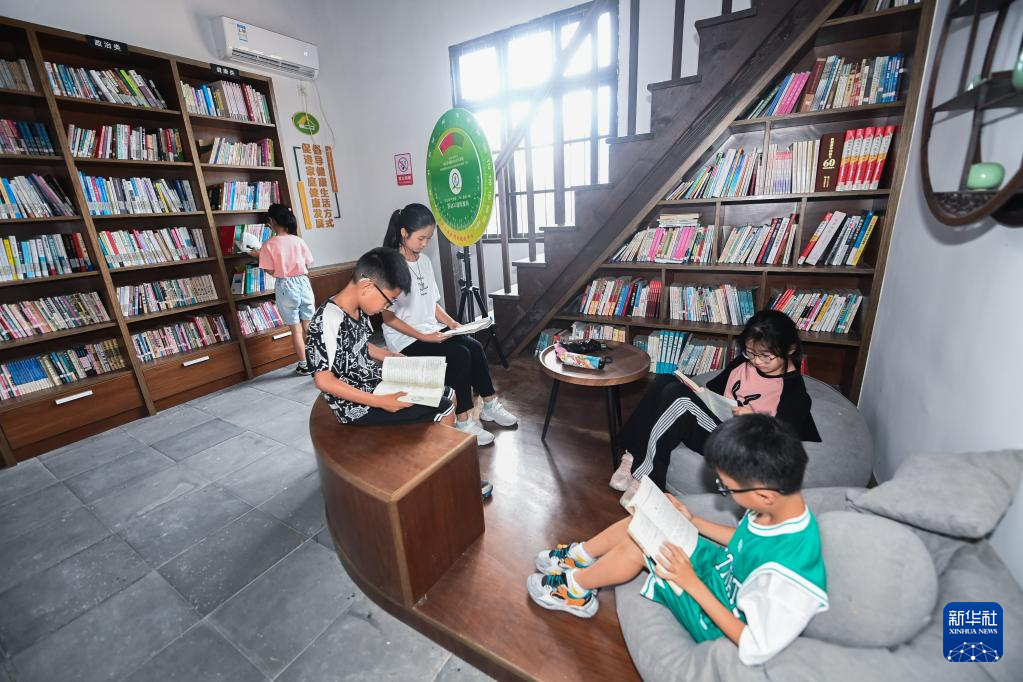 7月5日,孩子们在织里镇伍浦村文化礼堂内的图书室看书。