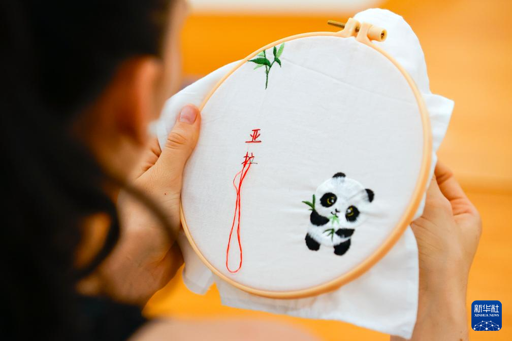 7月31日,在成都大运村,阿根廷运动员亚拉·纳瓦罗体验在蜀绣作品上绣上自己的中文名字。