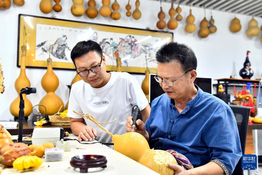 8月10日,在枣庄市薛城区葫芦刻绘非遗工坊,“周氏葫芦刻绘”非遗传承人周建华(右)边创作边传授徒弟刻绘技法。