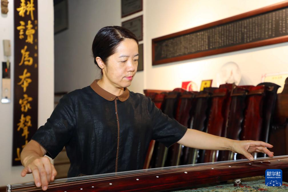 8月10日,在枣庄市市中区传统古琴制作非遗工坊,非遗传承人王新娟在调试古琴。