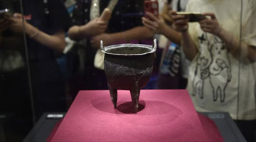 8月12日,观众在位于河南省洛阳市偃师区的二里头夏都遗址博物馆参观网格纹铜鼎。
