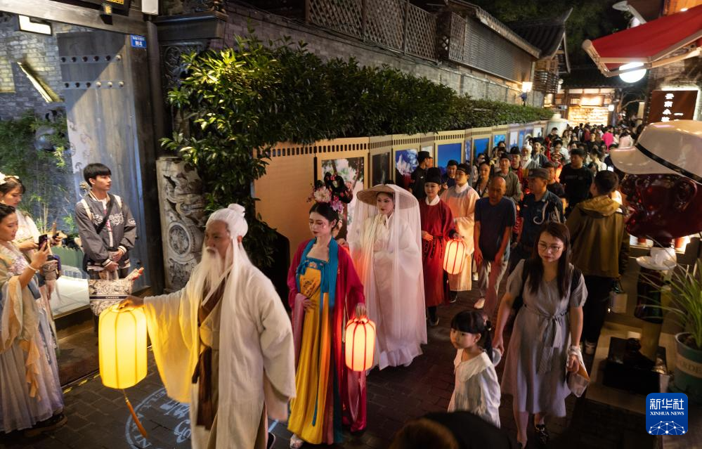 在成都宽窄巷子新“十二月市”街区,装扮成唐宋时代人物形象的演员在巡游表演(9月29日摄)。