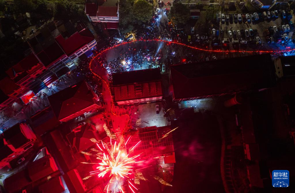 2月19日,在澧浦镇下宅村,村民们抬着100多节长的传统板凳龙在村落中穿行,与燃放的焰火组成了美丽的年俗画面(无人机照片)。
