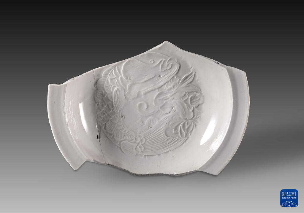 山西霍州陈村瓷窑址出土的元代细白瓷鱼纹印花盘残片。