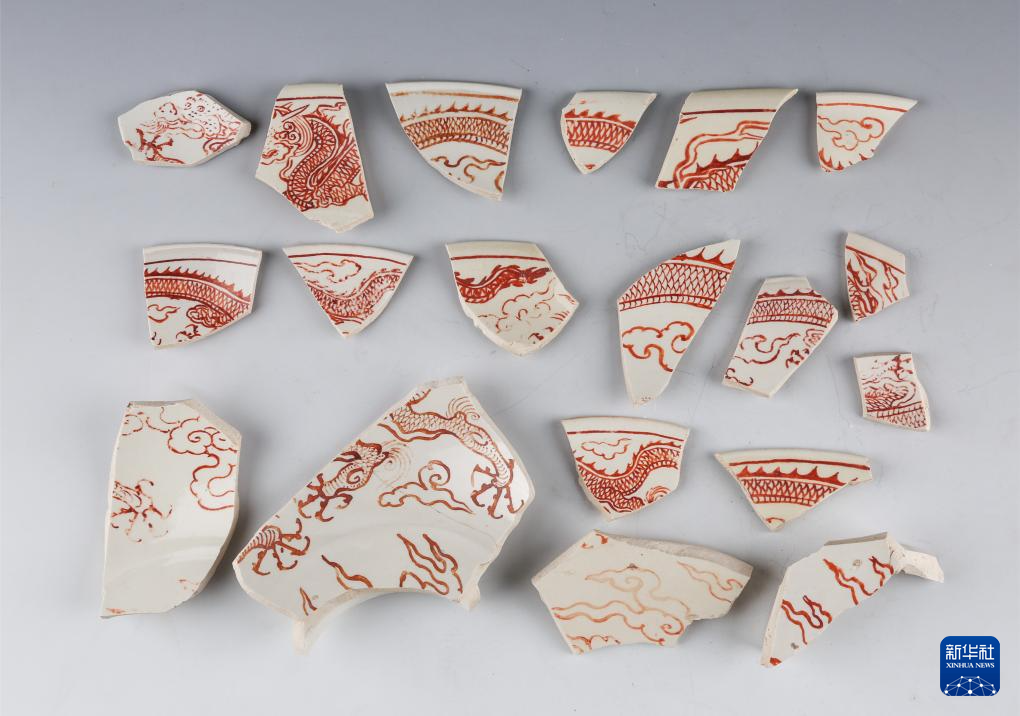 山西霍州陈村瓷窑址出土的明代细白瓷矾红彩龙纹残片。