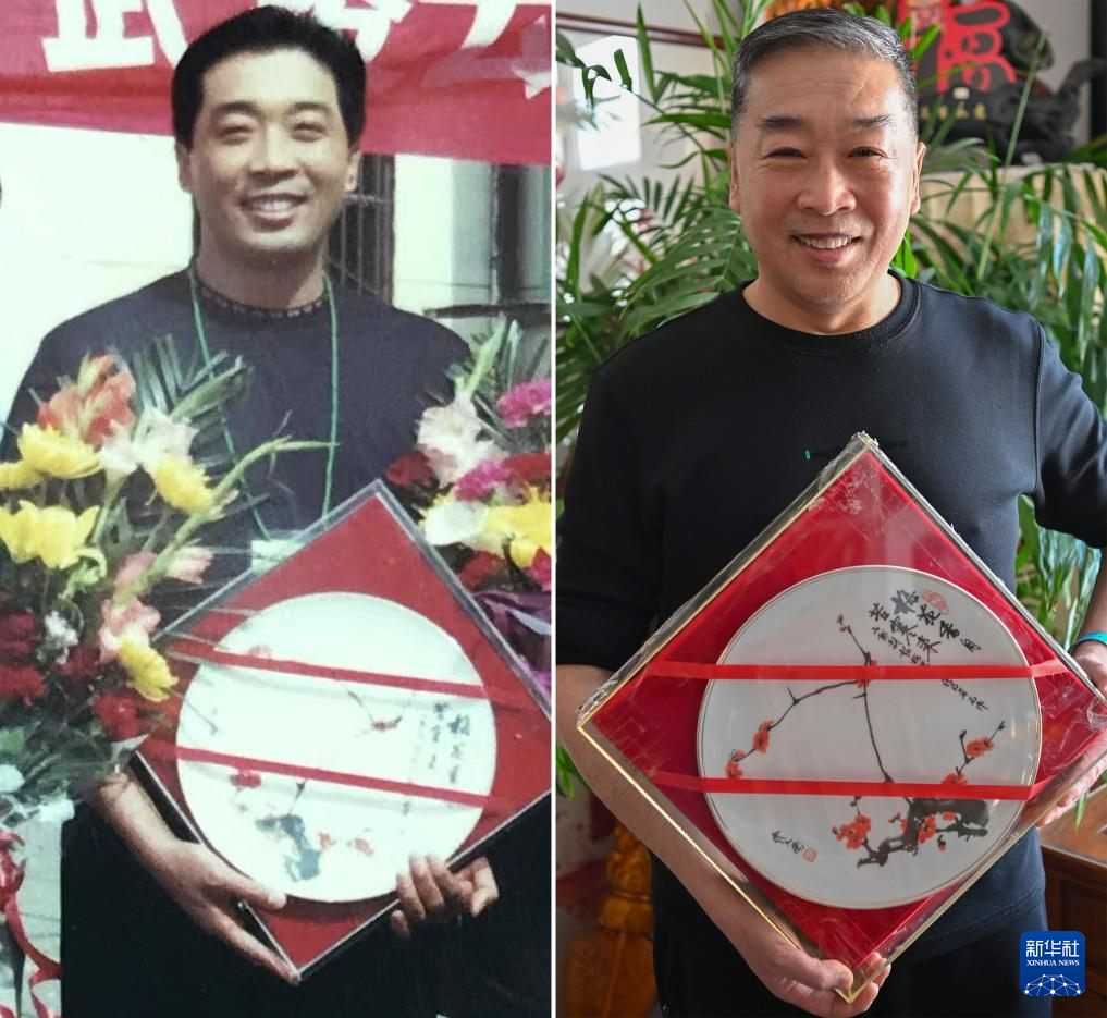 拼版照片:左图为武凌云获得“梅花奖”时留影(资料照片);右图为2024年3月26日,武凌云在位于太原市杏花岭区的家中留影(新华社记者杨晨光摄)。