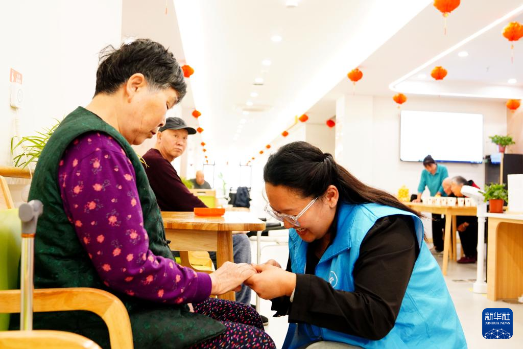 4月14日,在菏泽市巨野县凤凰社区党群服务中心居家养老服务中心,工作人员在帮老人剪指甲。