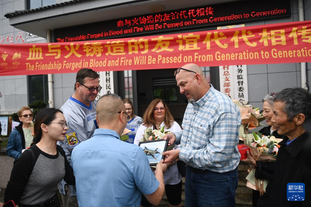 在衢州江山市大桥镇芳源村,获救美国军人后代向村民赠送纪念品(4月16日摄)。