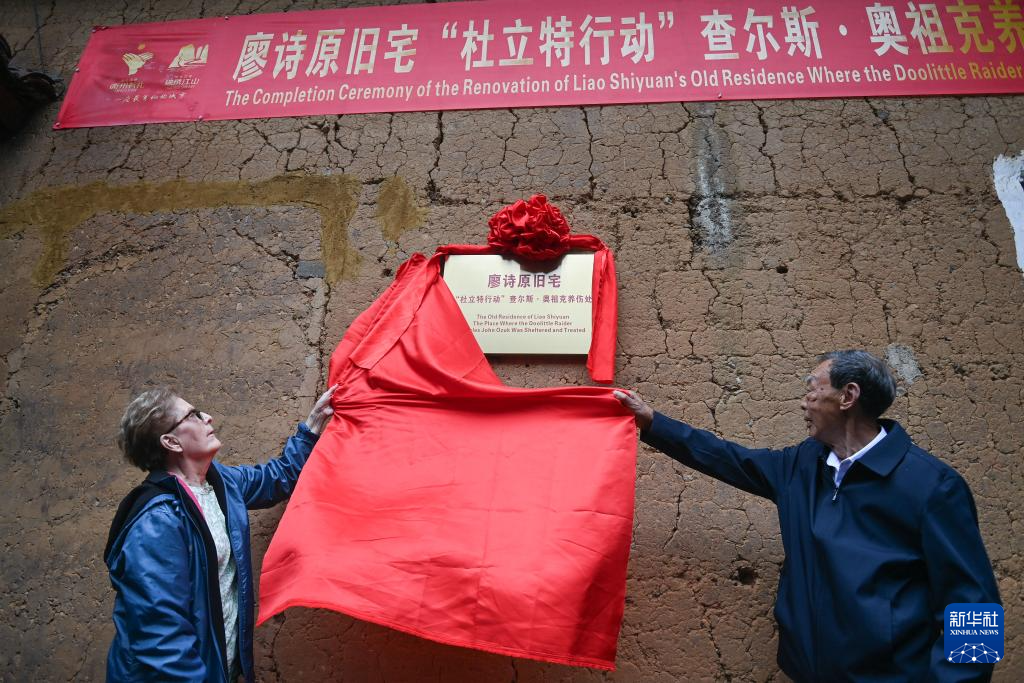 4月17日,在衢州江山市张村乡龙头店村,“杜立特行动”3号机领航员查尔斯·奥祖克的女儿苏珊·奥祖克(左)与村民廖明发一起为修缮后的“廖诗原旧宅”揭牌。1942年,村民廖诗原(廖明发的父亲)一家曾悉心照顾跳伞降落的查尔斯·奥祖克。2018年,苏珊·奥祖克捐赠1.5万美元修缮了这座老屋。