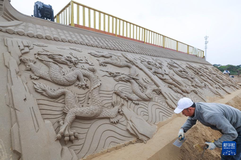 4月22日,工作人员在给“九龙壁”沙雕做扫尾清理工作。