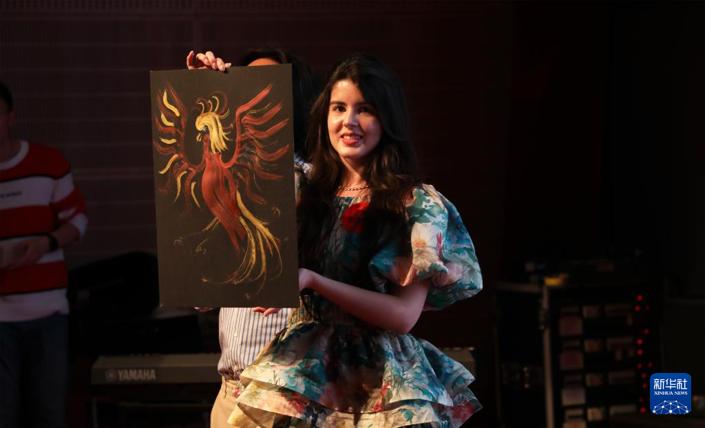 4月28日,在比利时布鲁塞尔,参赛选手在“汉语桥”世界大学生中文比赛比利时赛区决赛中展示画作。