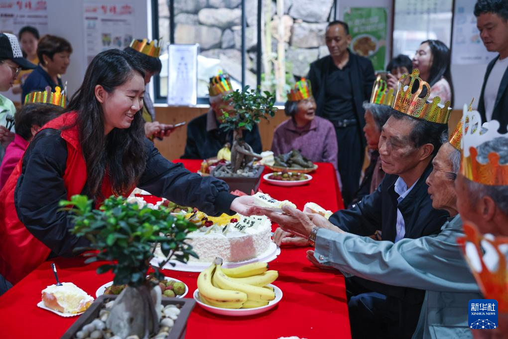 6月5日,老人在东白山村文化礼堂内参加集体生日宴,志愿者为老人送上生日蛋糕。