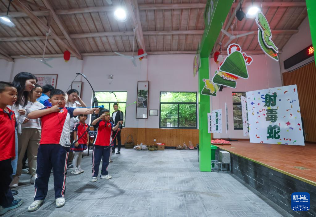 6月5日,孩子们在东白湖镇东白山村文化礼堂参加“射五毒”游戏。