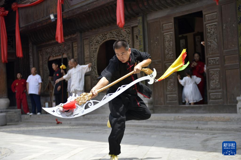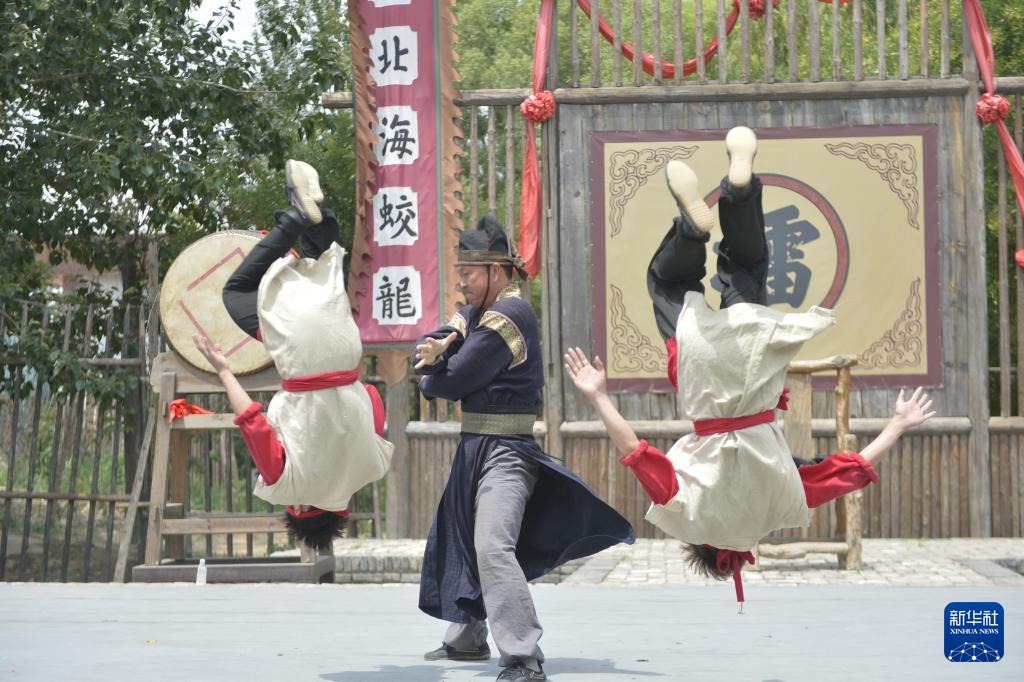 6月27日,武师在菏泽郓城水浒好汉城表演武术。新华社记者 刘力航 摄