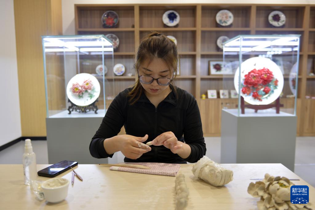6月27日,工艺师在菏泽非遗传承馆制作3D立体牡丹陶瓷作品。新华社记者 刘力航 摄