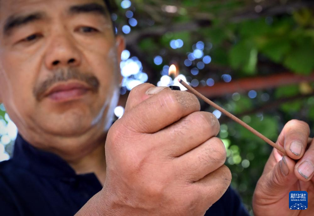 张书芳将制成的线香点燃,进行“品香”,从而检验香品是否合格(7月3日摄)。