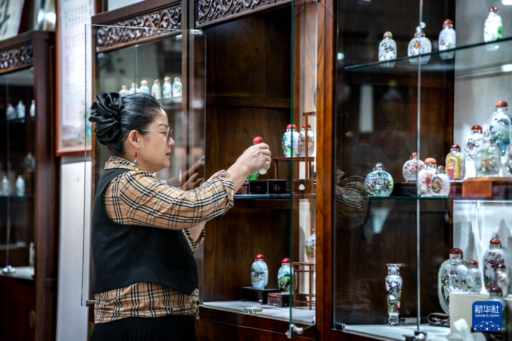 孙鸿雁在位于昆明官渡古镇的滇派内画传习馆内整理展柜里的内画工艺品(7月3日摄)。