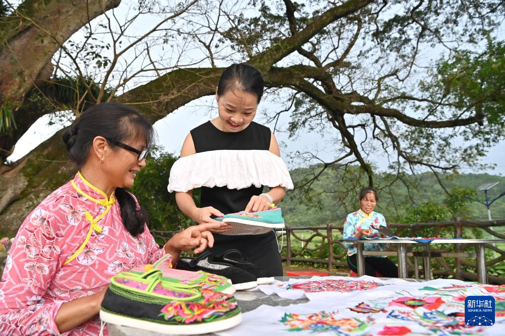 凌漫丽(中)在田东县义圩镇朔晚村跟村民探讨绣品花样(8月20日摄)。