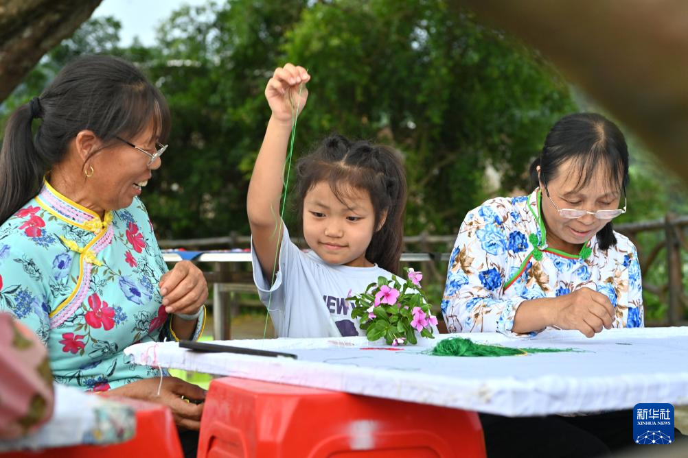 在田东县义圩镇朔晚村,一名小朋友在学习刺绣(8月20日摄)。