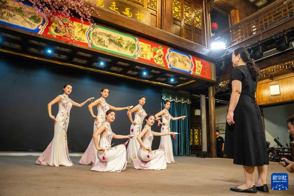 9月3日,在常德河街,常德丝弦国家级非遗传承人朱晓玲(右一)在演出前指导青年演员排练。