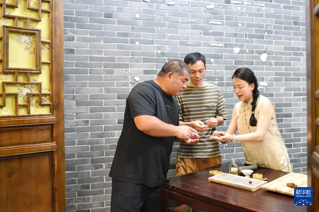 9月3日,在常德河街,传统香制作技艺非遗传承人钟玲(右一)向游客讲解熏香制作。