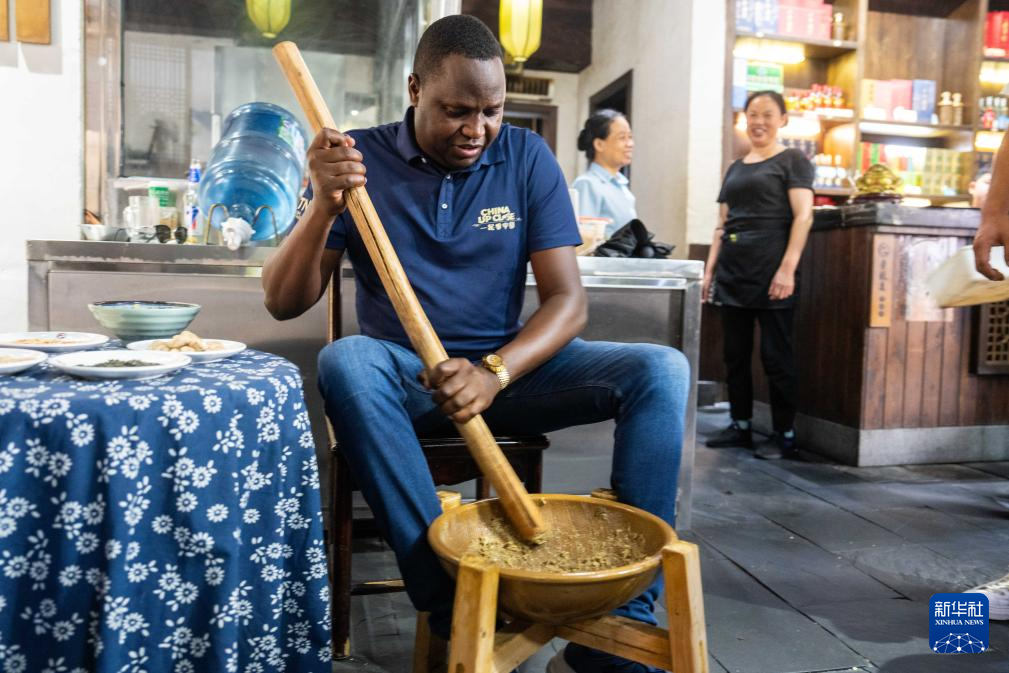 9月3日,在常德河街,外国游客体验非遗美食擂茶的制作。